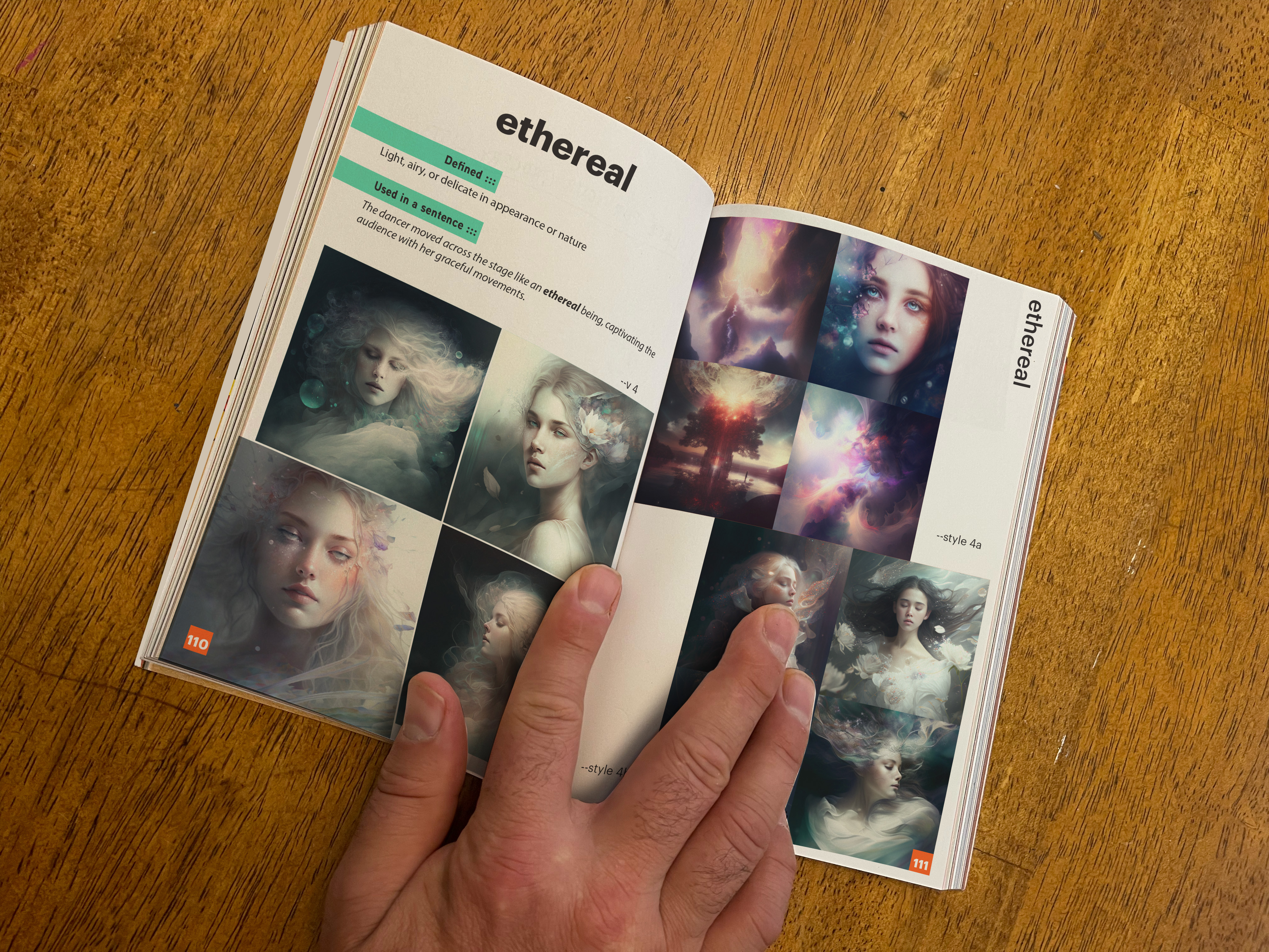 This book is a little bit different. It is one part dictionary, and one part visual word study with Midjourney thru various versions. Each word is defined, used in a sentence and explored as a render in versions 4, --style 4a, 4b, 5 and 5.1